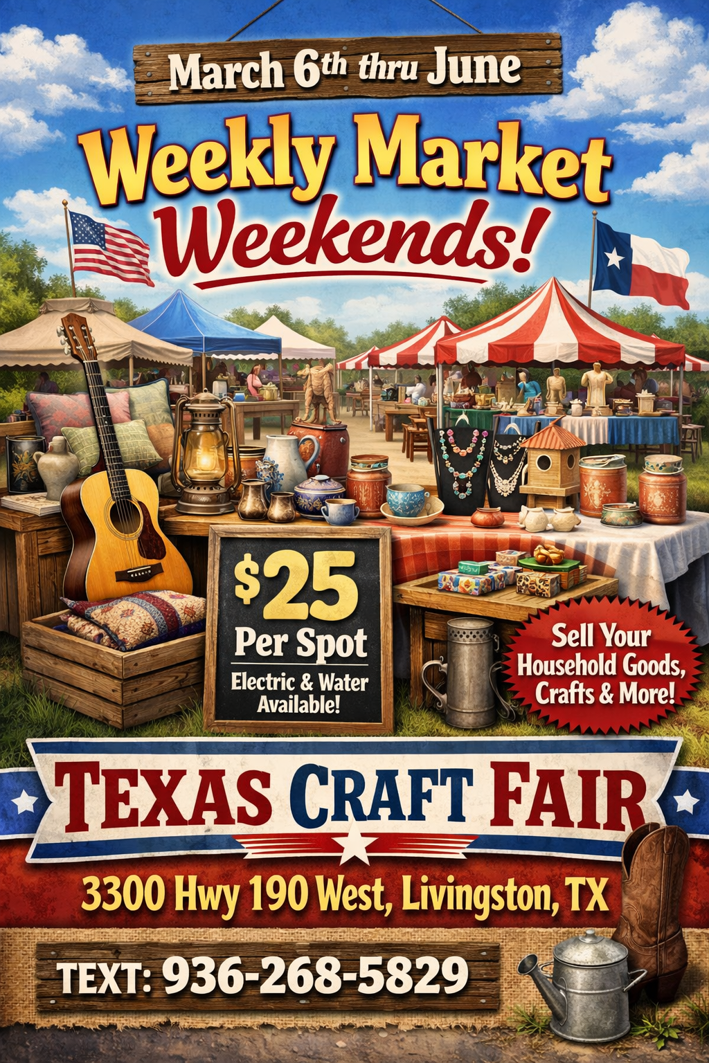 Texas Craft Fair is a community driven outdoor market destination located in the heart of East Texas, serving Livingston, Polk County, and nearby towns along Highway 190. Known for seasonal events, family friendly weekends, and a wide mix of local sellers, Texas Craft Fair brings together shoppers and small businesses for markets that feel welcoming, easy to access, and worth the drive. You can find the Texas Craft Fair property at 3300 Hwy 190 West in Livingston, Texas, about two miles west of Walmart, making it a convenient stop for locals and visitors exploring Polk County. Every year, our Spring Market Season runs from March through June and features weekly market weekends where vendors can set up and sell handmade crafts, boutique items, antiques, vintage goods, household and yard sale finds, reclaimed treasures, and one of a kind curiosities. We are always looking for vendors, crafters, junkers, and antiquers who want steady exposure and an affordable setup opportunity in East Texas. Beyond the spring markets, Texas Craft Fair also hosts special event weekends like a Valentines Market and an Easter Market, including a free egg hunt and an Easter Bunny for families. When fall arrives, the season shifts into Haunted Woods and Night Markets, running from the last weekend of September through the first weekend of November, combining nighttime shopping with one of the area’s most talked about seasonal attractions. If you are searching for markets in Livingston, a craft fair in Polk County, or a place to set up as a vendor in East Texas, Texas Craft Fair is built for community, commerce, and good weekends on the calendar.
