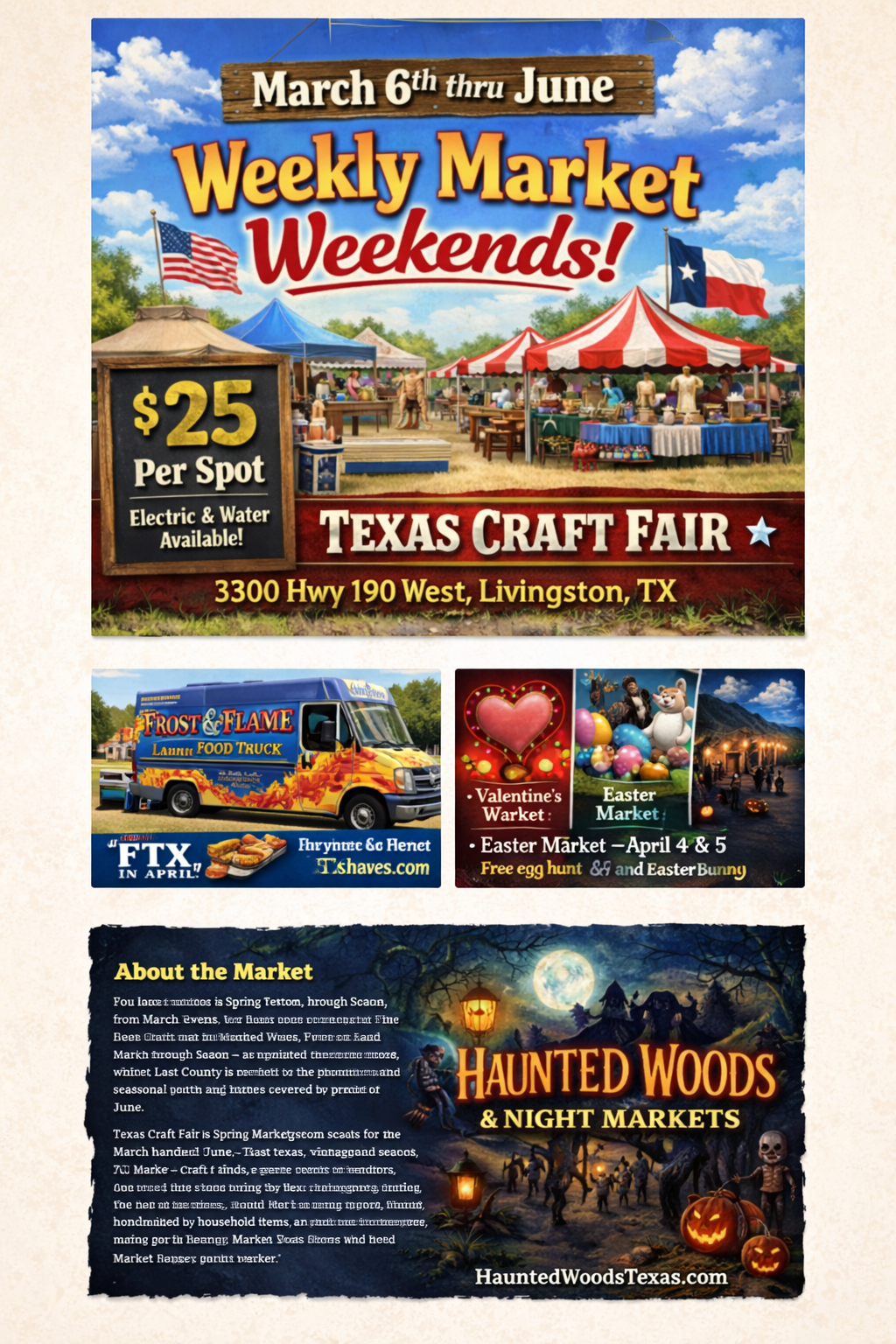 Texas Craft Fair is a community driven outdoor market destination located in the heart of East Texas, serving Livingston, Polk County, and nearby towns along Highway 190. Known for seasonal events, family friendly weekends, and a wide mix of local sellers, Texas Craft Fair brings together shoppers and small businesses for markets that feel welcoming, easy to access, and worth the drive. You can find the Texas Craft Fair property at 3300 Hwy 190 West in Livingston, Texas, about two miles west of Walmart, making it a convenient stop for locals and visitors exploring Polk County. Every year, our Spring Market Season runs from March through June and features weekly market weekends where vendors can set up and sell handmade crafts, boutique items, antiques, vintage goods, household and yard sale finds, reclaimed treasures, and one of a kind curiosities. We are always looking for vendors, crafters, junkers, and antiquers who want steady exposure and an affordable setup opportunity in East Texas. Beyond the spring markets, Texas Craft Fair also hosts special event weekends like a Valentines Market and an Easter Market, including a free egg hunt and an Easter Bunny for families. When fall arrives, the season shifts into Haunted Woods and Night Markets, running from the last weekend of September through the first weekend of November, combining nighttime shopping with one of the area’s most talked about seasonal attractions. If you are searching for markets in Livingston, a craft fair in Polk County, or a place to set up as a vendor in East Texas, Texas Craft Fair is built for community, commerce, and good weekends on the calendar.